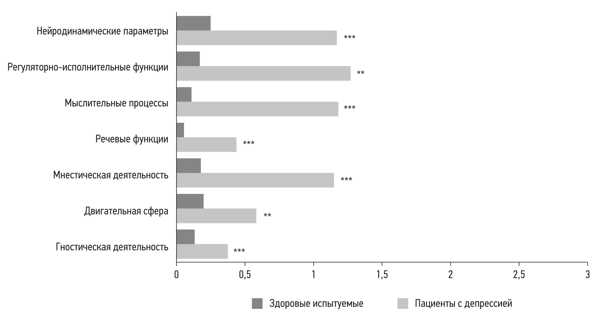 Нейропсихологическое исследование когнитивного профиля пациентов. По результатам нейропсихологической диагностики установлено, что все пациенты, страдающие от депрессии, демонстрируют когнитивный дефицит в различных аспектах психической деятельности, таких как мнестические процессы, регуляторно-исполнительные функции и нейродинамика психической активности. Отмечаются выраженная клиническая неоднородность и значительная вариативность выраженности когнитивных нарушений в данной группе. Полученные данные свидетельствуют о том, что выраженность симптомов и их сочетание в клинической картине не могут быть классифицированы как нейропсихологический синдром. Вместе с тем их представленность и специфика проявлений могут быть оценены в контексте формирования когнитивного профиля данной группы пациентов (рис. 1). Полученные данные были подвергнуты статистической обработке с использованием программы SPSS Statistics и U-критерия Манна–Уитни (см. рис. 1; табл. 1), отражающей индекс выраженности нарушений когнитивных функций (в баллах).