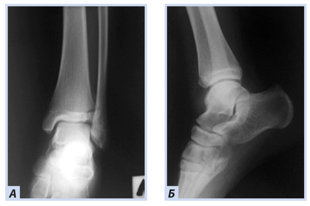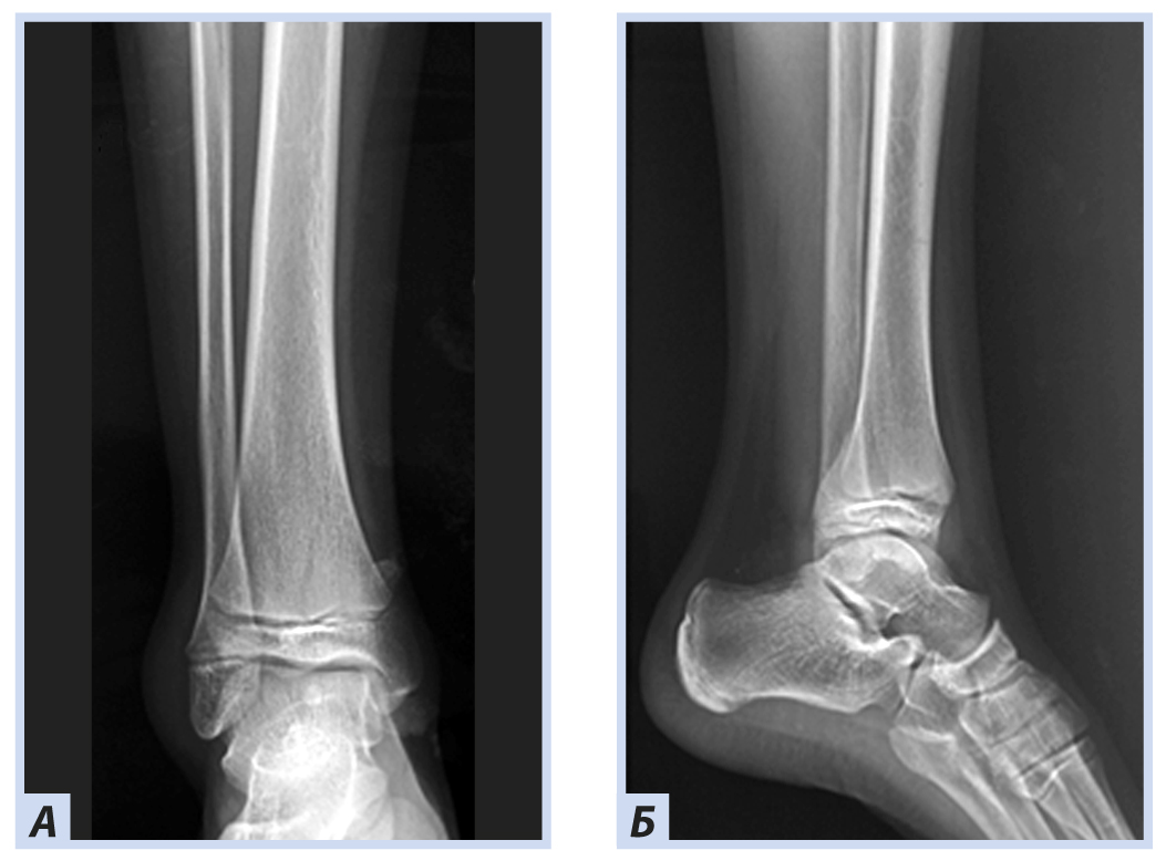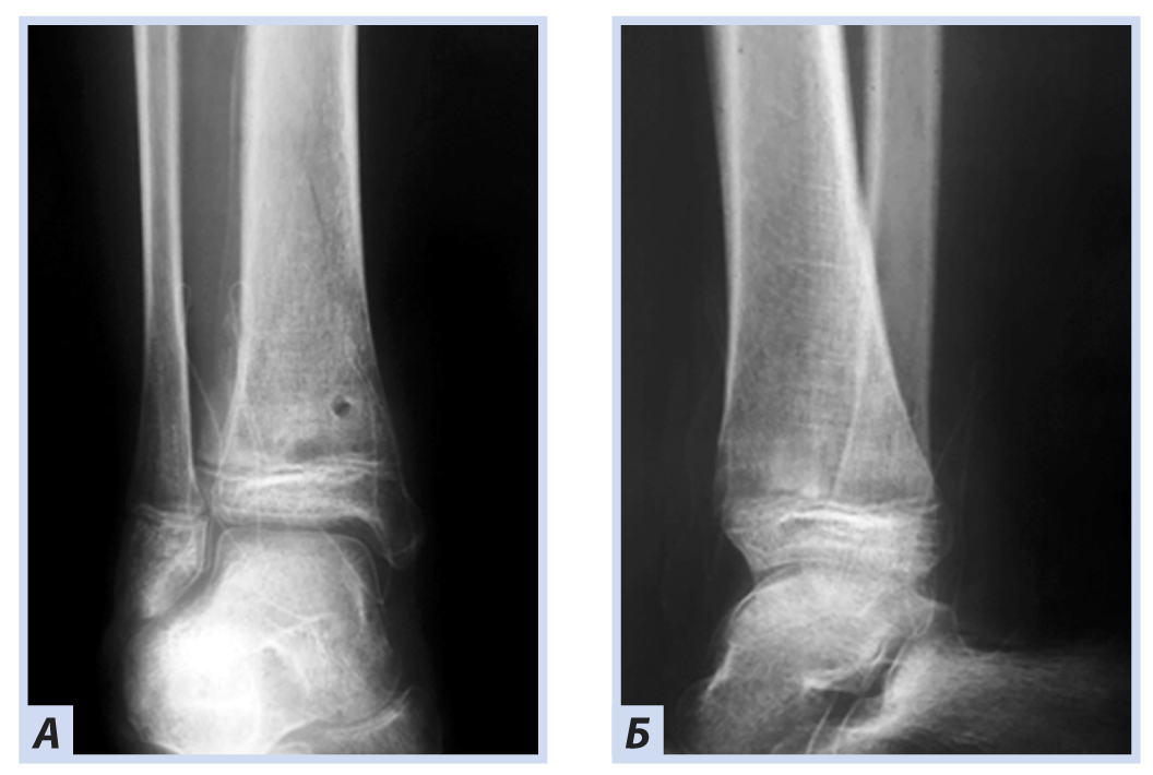Рис. 6. Девочка, 13 лет. Рентгенограммы дистального отдела костей левой голени. Остеоэпифизелиз дистального отдела левой большеберцовой кости Salter–Harris, III тип, Tillaux fractures: А — прямая проекция; Б — боковая проекция.