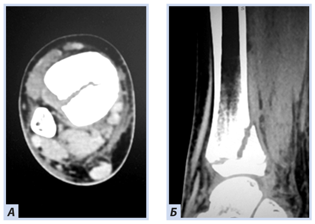 Рис. 2. Тот же пациент. Компьютерная томография дистального отдела костей голени. Дистальный остеоэпифизеолиз правой большеберцовой кости: А — горизонтальная плоскость; Б — саггитальная плоскость.