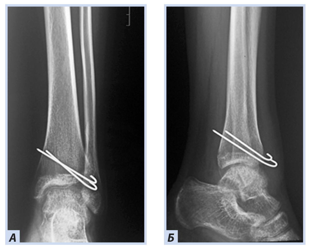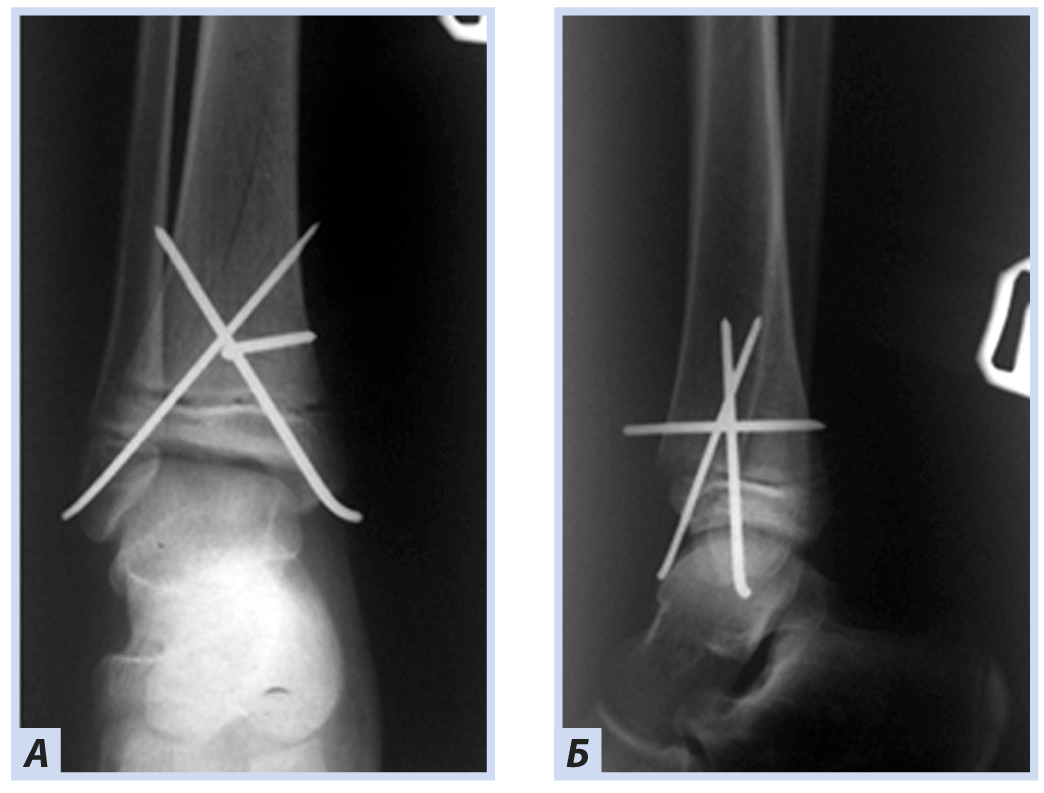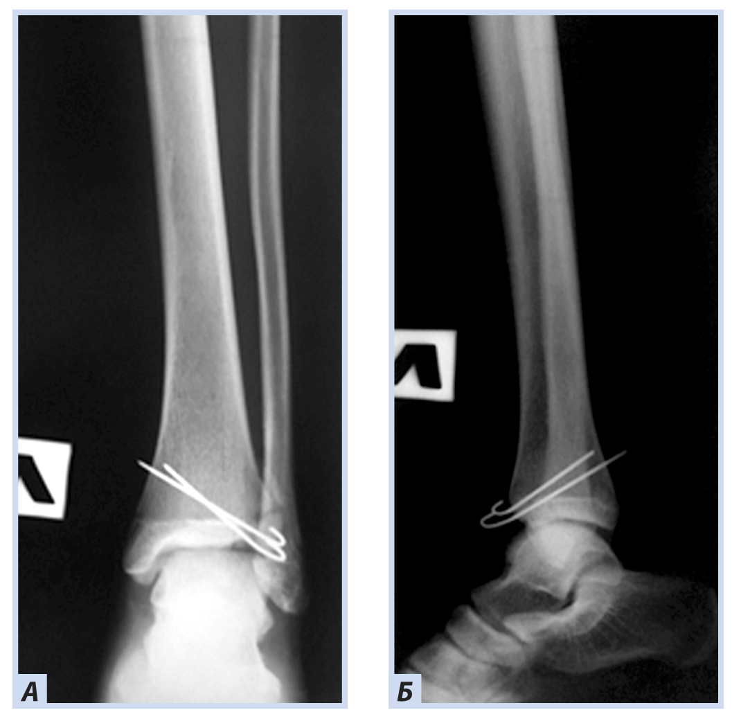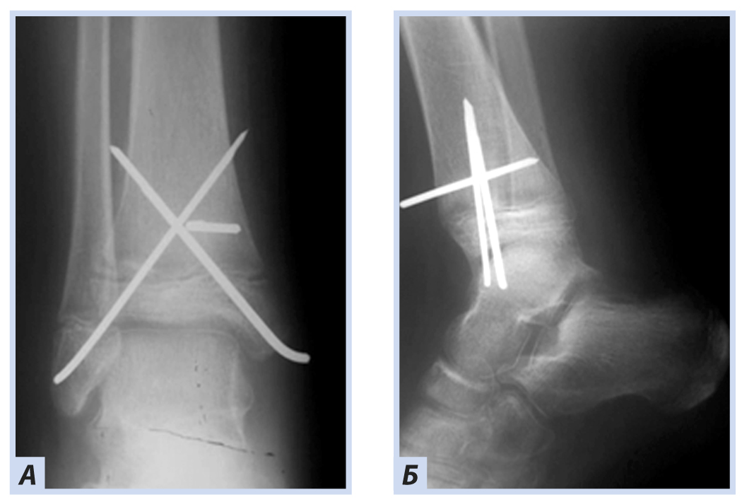 Рис. 7. Тот же пациент. Рентгенограммы дистального отдела костей левой голени. Остеосинтез перекрещивающимися спицами: А — прямая проекция; Б — боковая проекция.