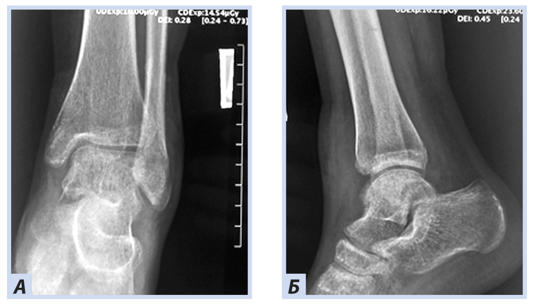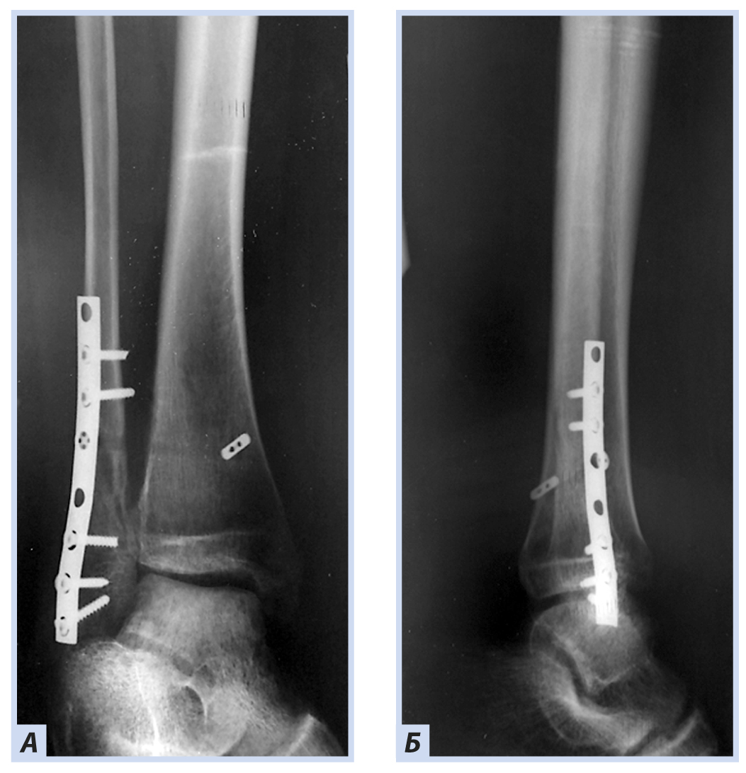 Рис. 4. Тот же пациент. Рентгенограммы дистального отдела костей правой голени через 4 нед. Консолидация костных отломков: А — прямая проекция; Б — боковая проекция.