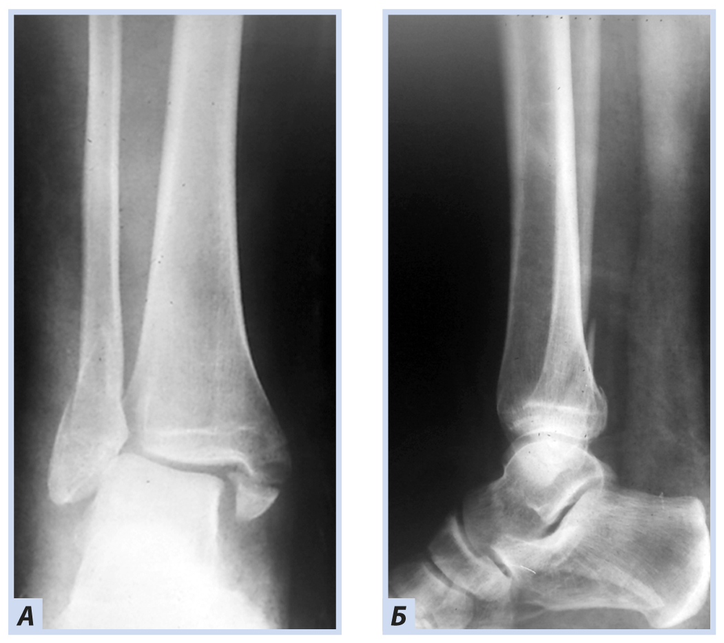 Рис. 10. Мальчик, 16 лет. Рентгенограммы дистального отдела костей правой голени. Перелом обеих лодыжек правого голеностопного сустава с подвывихом стопы кнаружи: А — прямая проекция; Б — боковая проекция.