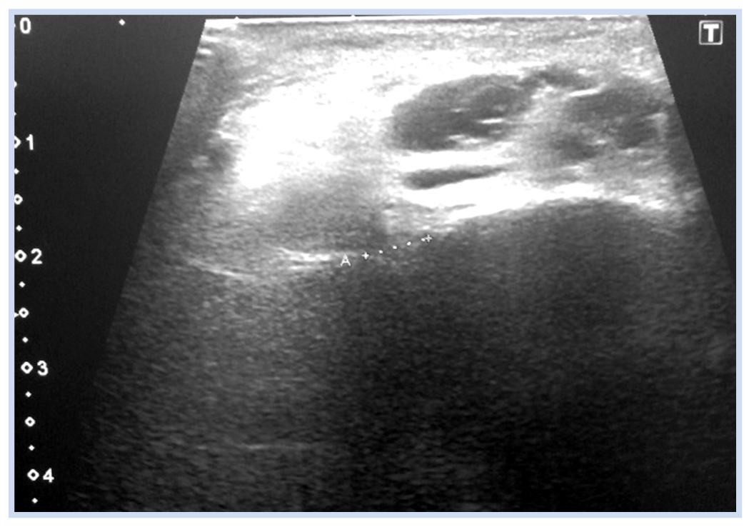 Рис. 11. Тот же пациент. Ультразвуковoе исследование дистального межберцового синдесмоза. Признаки разрыва передней тибиофибулярной связки.