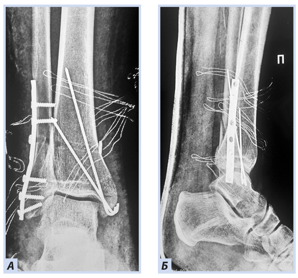 Пациентам с изолированным переломом наружной лодыжки ниже уровня синдесмоза остеосинтез выполнен закрыто перекрещивающимися спицами. Остеосинтез медиальной лодыжки в 2 случаях выполнен спицами, в 4 — методом динамического компрессионного остеосинтеза по Weber. Всем пациентам при сопутствующем диафизарном переломе малоберцовой кости перелом фиксировали пластиной, межберцовый синдесмоз в одном случае фиксирован позиционным винтом, в трех остальных — системой искусственной связки. Дополнительная иммобилизация поврежденного сегмента осуществлялась при помощи задней гипсовой лонгеты, наложенной до коленного сустава.
