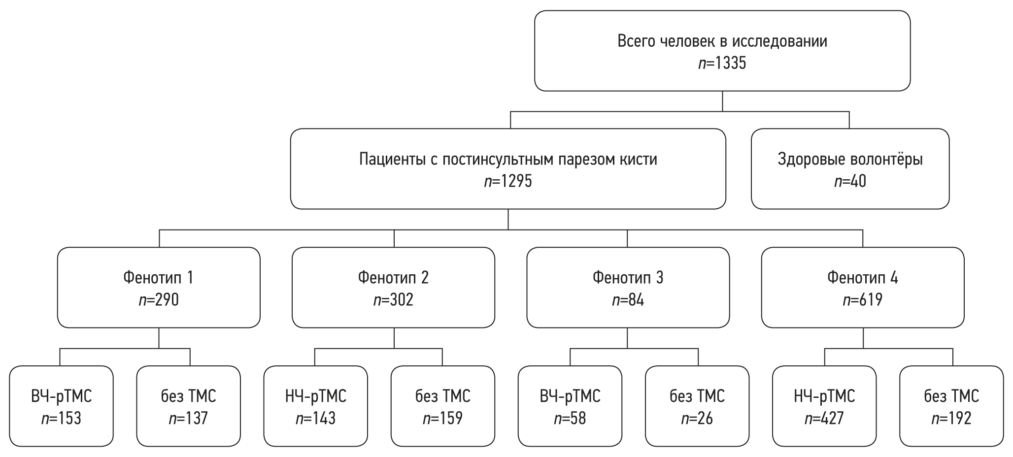 В ретроспективное обсервационное исследование по данным регистра нейрореабилитационного центра на основании обработки обезличенных информационных карт включены пациенты с верифицированным постинсультным парезом верхней конечности, проходившие стандартный курс реабилитационного лечения в сочетании или без рТМС. Выборка пациентов на основании клинико-нейрофизиологических показателей была разделена на четыре фенотипа. В рамках каждого фенотипа изучалась адъювантная эффективность регресса пареза кисти непосредственно после курса рТМС (основная подгруппа лечения) в сравнении с подгруппой стандартной реабилитации без транскраниальной стимуляции.