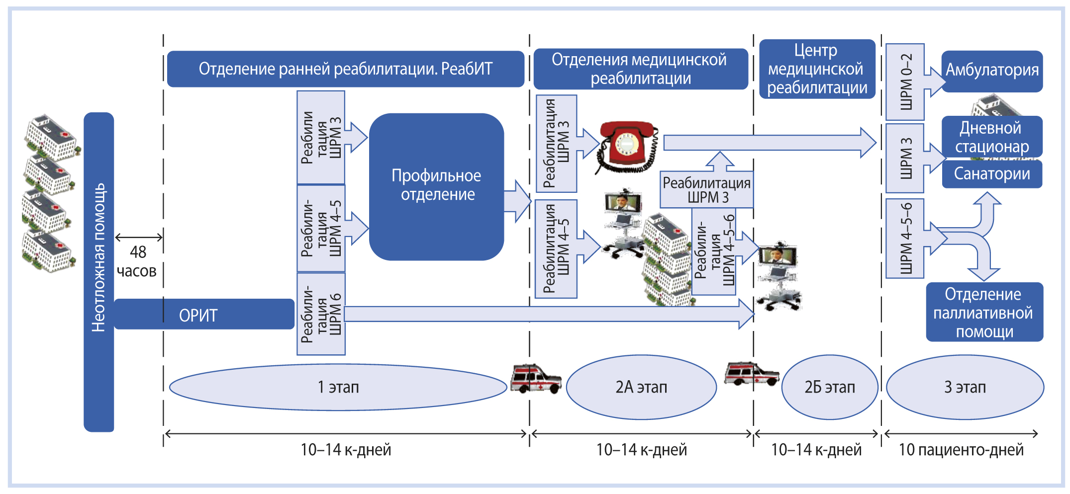 В частности, если на момент купирования неотложного состояния пациент соответствует описанию градации 5, это свидетельствует о высокой вероятности развития ПИТ-синдрома или выраженном двигательном дефиците в связи с поражением центральной или периферической нервной системы. В рамках ШРМ 6 могут быть описаны самые разнообразные нозологии — от черепно-мозговой травмы и аноксии с развитием хронического нарушения сознания до острой воспалительной демиелинизирующей полиневропатии и последствий COVID-19. Соответственно, пациенты, несмотря на объединяющий их тяжелый ШРМ, имеют совершенно разные задачи и прогноз. Если в период пребывания в ОРИТ, а затем в профильном отделении состояние не улучшается, такому пациенту необходима реабилитация в условиях отделения медицинской реабилитации на этапе 2А. Решение о переводе принимает консилиум в составе реаниматолога, специалиста по профилю неотложного состояния и врача физической и реабилитационной медицины регионального центра маршрутизации. В условиях палаты высокой зависимости отделения медицинской реабилитации проводится базовая программа реабилитации ПИТ-синдрома [5] с дополнительными опциями восстановления двигательного дефицита и гравитационного градиента, повышения толерантности к нагрузкам, социально-бытовой адаптации и купирования когнитивно-эмоционального дефекта. При положительной динамике пациент повышает уровень активности, и при оценке по ШРМ 3–4 балла может быть переведен на амбулаторный этап лечения в условиях дневного стационара. Если течение ПИТ-синдрома или тяжесть последствий церебральной недостаточности за период лечения сохраняются, он представляется на телеконсилиум с центром нейрореабилитации с целью определения показаний для дополнительного 2Б-этапа реабилитационного лечения высокой интенсивности (более 5 ч/день). По завершении этапа оценивается степень реализации реабилитационного потенциала: при уровне 2–3 балла по ШРМ пациента выписывают для амбулаторного лечения; при уровне ШРМ 5 следует выписка пациента домой или его перевод в паллиативное отделение с повторным телеконсилиумом через 1–3 мес. В случае положительной динамики пациенту может быть предоставлен повторный курс реабилитации в отделении медицинской реабилитации.