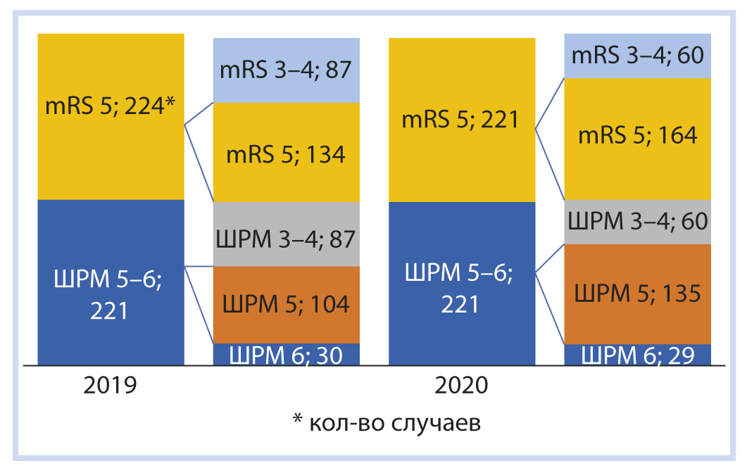 Примечательно, что в 2020 и 2021 гг. количество пациентов с оценкой 3–4 балла полностью совпадает при оценке по mRS и ШРМ, что указывает на идентичность инструментов для пациентов с уровнем зависимости умеренной степени.