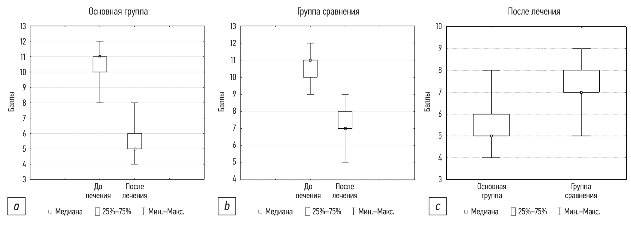 Рис. 1. Динамика тяжести инсульта после курса реабилитации по шкале NIHSS: a ― основная группа; b ― контрольная группа; c ― сравнение эффективности лечения между группами (p <0,05).
