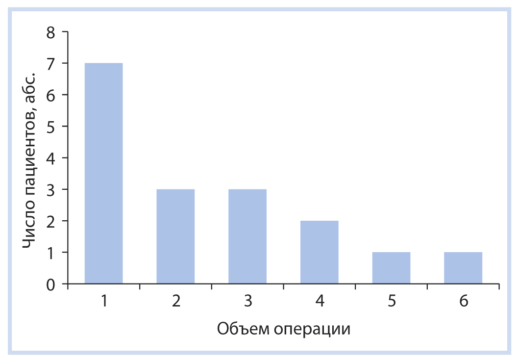 Рис. 1. Распределение больных группы 1 в зависимости от объема хирургического вмешательства: 1 — резекция проксимального отдела бедренной кости с эндопротезированием тазобедренного сустава; 2 — резекция дистального отдела бедренной кости с эндопротезированием коленного сустава; 3 — реэндопротезирование коленного сустава; 4 — резекция проксимального отдела большеберцовой кости с эндопротезированием коленного сустава; 5 — экстирпация бедренной кости с эндопротезированием тазобедренного и коленного суставов; 6 — резекция дистального отдела бедренной кости и проксимального отдела большеберцовой кости с эндопротезированием коленного сустава.