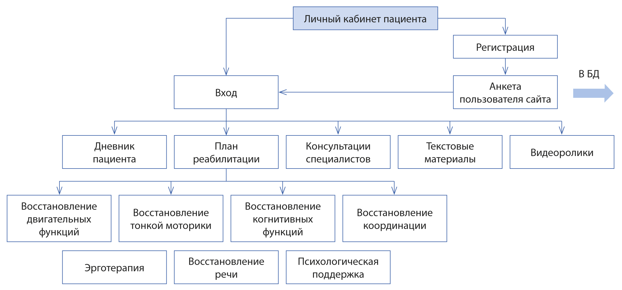Для зарегистрированных пользователей после прохождения электронного опроса о больном открываются разделы «Дневник пациента», «План реабилитации» и «Консультации специалистов» (рис. 3). Дизайн личного кабинета для зарегистрированного пользователя ориентирован на предоставление информации в доступном для понимая виде с учетом разной степени владения компьютерной техникой. Для этого в личном кабинете информация представляется в формате блоков с изображением.