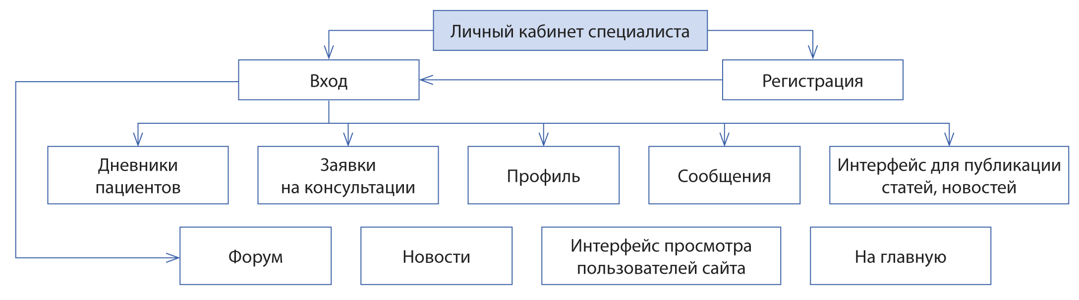 Благодаря интеграции всех ключевых разделов сайта, личный кабинет специалиста позволяет своевременно определять и контролировать ведение дневников пациентов, регистрацию новых пользователей, модерировать работу форума, а также публиковать сообщения и новости для посетителей сайта.