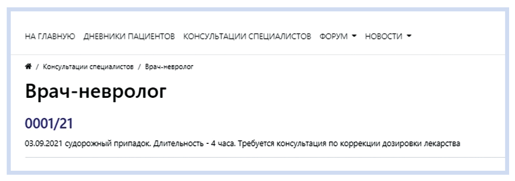 Рис. 5. Запрос на консультацию от пациента с ИБ № 0001/21 к врачу-неврологу