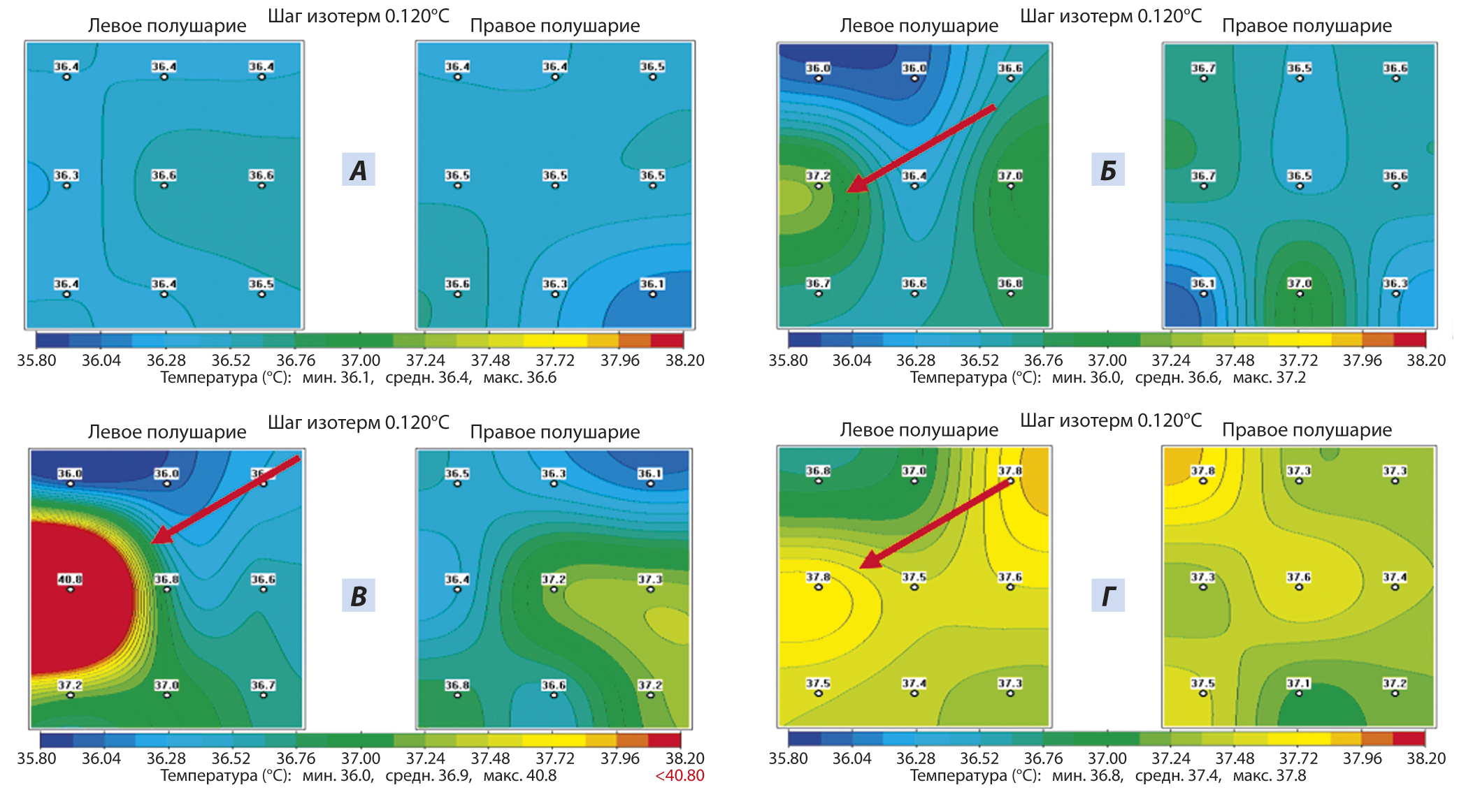 Рис. 1. Температура левого и правого полушария коры головного мозга у спортсмена-боксера: А — перед тренировкой; Б — после 20-минутной разогревающей тренировки; В — после спарринга; Г — через час после спарринга (по [36])