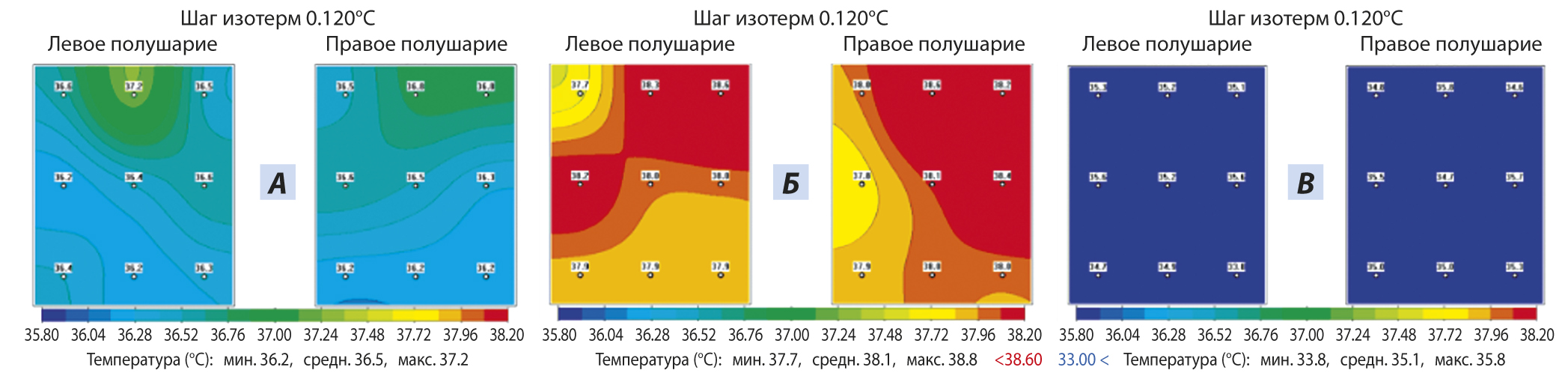 Рис. 2. Температурные карты больших полушарий спортсмена-боксера: А — перед спаррингом; Б — после спарринга (3 раунда по 3 мин); В — через 60 мин после селективной гипотермии коры мозга, проведенной сразу после спарринга (по [36])