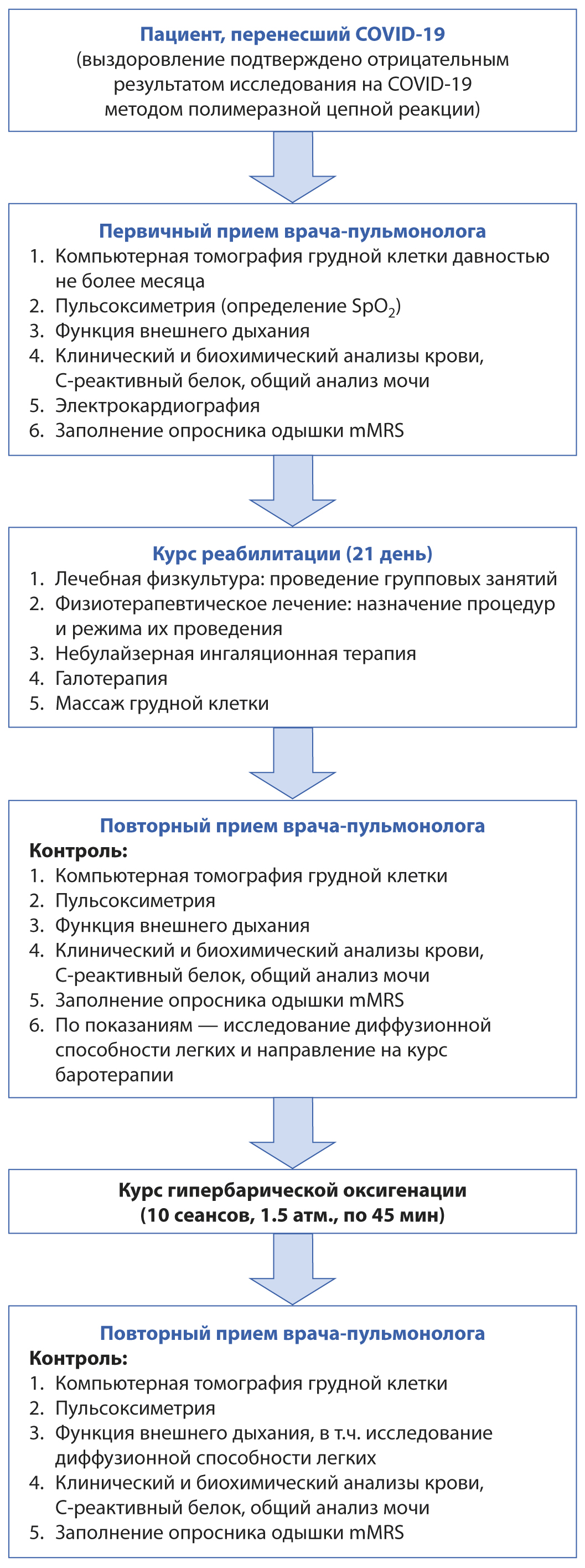 СПб ГБУЗ «ГКДЦ № 1» является крупнейшим лечебно-профилактическим амбулаторным учреждением Санкт-Петербурга, где проводится обследование и лечение больных различных профилей. С июня 2020 г. учреждение одним из первых в городе организовало реабилитационное лечение пациентов, перенесших коронавирусную пневмонию. За год (с июня 2020 по июнь 2021 г.) пульмонологическая реабилитация была проведена более чем 1000 пациентам. Обследование и ведение этих больных проводилось по следующему алгоритму (рис. 1).