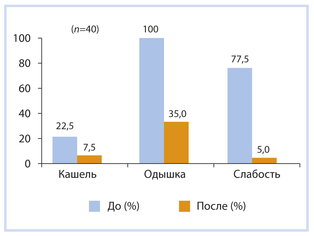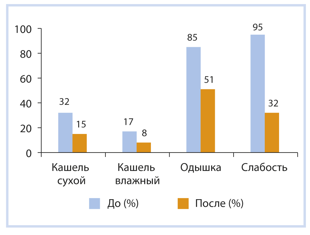 По завершении курса реабилитации была отмечена субъективная и объективная положительная динамика: у половины пациентов исчез или значительно уменьшился кашель, более чем у 1/3 больных исчезла одышка, а средний индекс одышки уменьшился в 1,4 раза (с 2,67 до 1,92 балла); рис. 2.