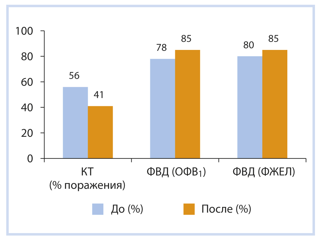 Всем пациентам оценивали клинический статус и выраженность одышки, выполняли пульсоксиметрию (показатели колебались в пределах нормальных значений — от 95 до 98%), определяли уровень СРБ в анализе крови (среднее значение 7,5), измеряли функцию внешнего дыхания (исходно и в пробе с бронхолитиком), выполняли электрокардиографию и компьютерную томографию (КТ) грудной клетки. Курс пульмонологической реабилитации проводился в течение 21 дня и включал следующие процедуры: занятия лечебной физкультурой (ежедневно по 45 мин), физиотерапевтические процедуры (сверхвысокочастотное электромагнитное поле, низкочастотную магнитотерапию, высокочастотную импульсную магнитотерапию, электрофорез лекарственных препаратов, СМТ-терапию (синусоидально модулированный ток), массаж грудной клетки), ингаляционную терапию (небулайзерное введение лекарственных средств, галоингаляции).