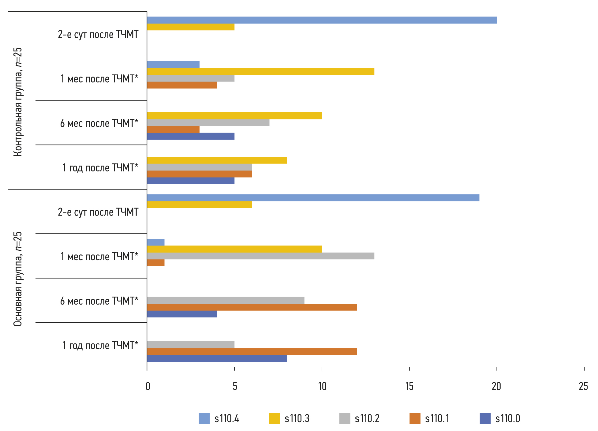 Представлен анализ домена s110 (Структура головного мозга), который оценивали по результатам проведённой нейровизуализации (рентгеновская компьютерная томография головного мозга) на вторые сутки после ТЧМТ, через 1 месяц, 6 месяцев и через 1 год после ТЧМТ (табл. 2).