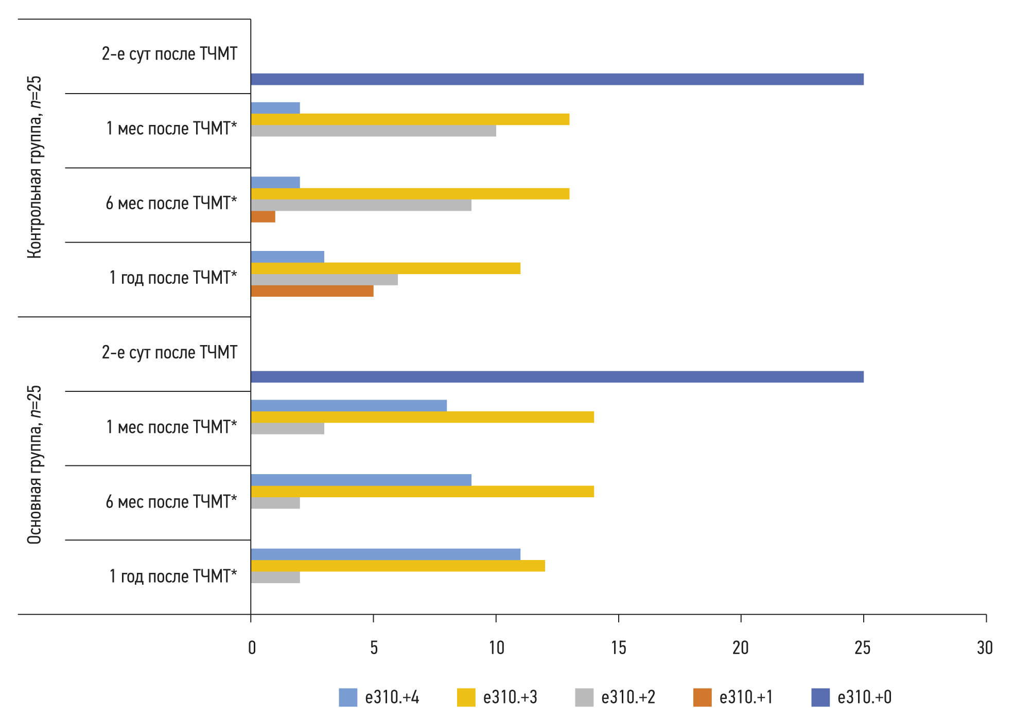 Наглядно показано, что вовлечение родственника в реабилитацию улучшает процесс восстановления пациента после ТЧМТ и мотивирует его к активному участию в реабилитации. Согласно представленным данным, через 1 месяц, 6 месяцев и 1 год после ТЧМТ выявлено, что в основной группе значительно преобладали дети с оценкой по МКФ +3 и +4, что говорит о большем участии родственников в комплексной реабилитации и подтверждается статистическими данными (р1 мес= 0,007, р6мес= 0,002, p1 год <0,001 соответственно).