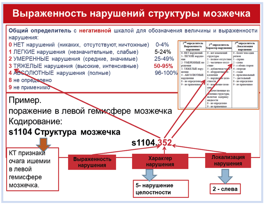 Определение степени нарушений структур. У пациента на РКТ головного мозга выявлено поражение в левой гемисфере мозжечка. По категории МКФ структура мозжечка кодируется s1104. Определяем степень нарушений. Для обозначения нарушений структуры есть три определителя: · 1-й определитель — выраженность нарушений; · 2-й определитель — характер нарушений; · 3-й определитель — локализация нарушений. В клиническом примере: 1-й определитель (цифра 3) показывает, что у данного пациента тяжелые нарушения (было бы еще понятнее, если при проведении РКТ описывали процент поражения, и в этом случае было бы легче поставить процентное соотношение поражения); 2-й определитель (цифра 5) — нарушение целостности; 3-й определитель (цифра 2) показывает, что локализация процесса слева. Далее назначаем специалиста МДРК, который будет заниматься восстановлением, и прописываем технологию. У данного пациента таким специалистом является врач физической и реабилитационной медицины (ФРМ) — невролог, который назначит медикаментозное лечение. После проведенного индивидуального плана медицинской реабилитации оцениваем определители степени нарушений на 7-й день и при выписке. | ||||