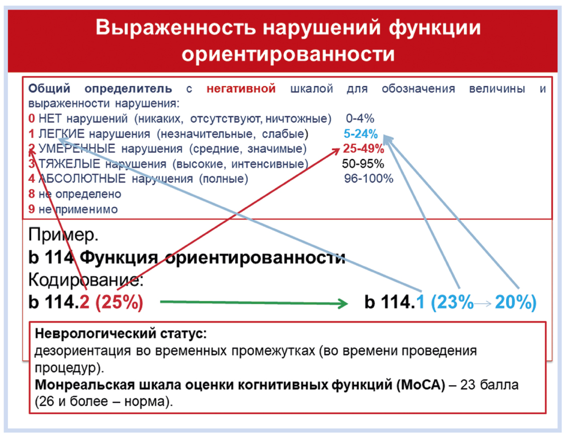 У пациента пострадало несколько функций: функция ориентированности, функция мышечной силы, функция артикуляции. Нарушение данных функций мы устанавливаем по неврологическому статусу, в определении выраженности нарушения функции используем шкалы. Рассмотрим категорию «функция ориентированности», которая обозначается кодом b114, и при поступлении, ориентируясь на неврологический статус и шкалу MoCA, устанавливаем определитель нарушения. В коде b114.2 (25%) цифра 2 обозначает умеренные нарушения, в процентном соотношении составляющая 25%. Далее назначаем специалиста МДРК, который будет заниматься восстановлением данной функции, и прописываем технологию. Данным нарушением функции занимается психолог, используя методы психологической реабилитации. На 7-й день и при выписке проводится повторная оценка. Наблюдается положительная динамика по мере использования реабилитационных технологий. К выписке степень нарушений с умеренных оценивается легкими b114.1 (20%) (цифра 1 и снижение в процентном соотношении). | ||||