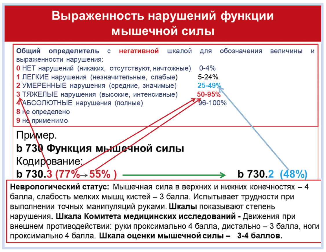 Таким образом, практическое применение утвержденных профессиональным сообществом протоколов диагностики и инструментов ВОЗ по использованию МКФ позволяет оценить все компоненты здоровья пациента, перенесшего инсульт, сформулировать реабилитационный диагноз и обосновать применение методов медицинской реабилитации в индивидуальной программе медицинской реабилитации пациента. Формирование реабилитационного диагноза на основе принципов МКФ является ключевым моментом в определении краткосрочных и долгосрочных целей для пациента членами МДРК, оценке реабилитационного потенциала и прогноза, составлении и изменении индивидуального плана медицинской реабилитации, управлении процессом медицинской реабилитации и формировании дальнейших рекомендаций при выписке.