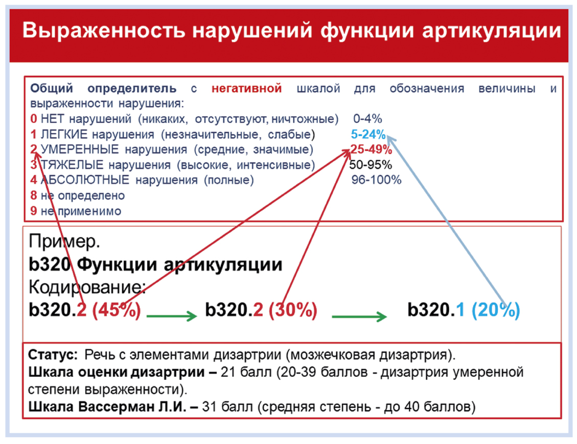 Категорию МКФ «функция артикуляции» кодируем b320. Нарушение данной функции установлено по неврологическому статусу, для определения степени нарушений используются шкала оценки дизартрии и шкала Л.И. Вассерман, которые выявляют дизартрию умеренной степени выраженности — b320.2 (45%). Определитель составил 2, что соответствует умеренным нарушениям и в процентном соотношении — 45%. По восстановлению нарушения данной функции использовались технологии медицинского логопеда, психолога, врача-рефлексотерапевта. Повторные исследования с использованием шкалы оценки дизартрии и шкалы Л.И. Вассерман показывают, как изменяются определитель нарушений и процентное соотношение от умеренных в легкие: b320.2 (45%) — при поступлении, b320.2 (30%) — на 7-й день, b320.1 (20%) — при выписке. | ||||