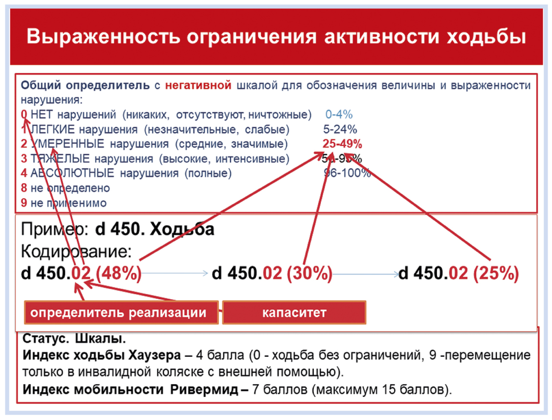 У данного пациента выявлены ограничения активности ходьбы, приема пищи, питья и речи. Определяется категория МКФ «ходьба» кодом d450. Ограничение активности «d450 ходьба» установлено по неврологическому статусу, индексу ходьбы Хаузера и индексу мобильности Ривермид. В степени нарушения активности используются два определителя: первый — реализации, второй — капаситета. При поступлении в реализации ходьбы у пациента нарушений не было — d450.02 (48%), цифра 0, а капаситет составил умеренные нарушения — цифра 2, что в процентном соотношении обозначается как 48%. Восстановлением ограничения активности занимался врач ФРМ, физический терапевт, которые использовали реабилитационные технологии. Повторные исследования неврологического осмотра и шкал показали, что при сохранении тех же определителей реализации и капаситета изменилось их процентное соотношение — от 48% при поступлении до 25% при выписке. | ||||