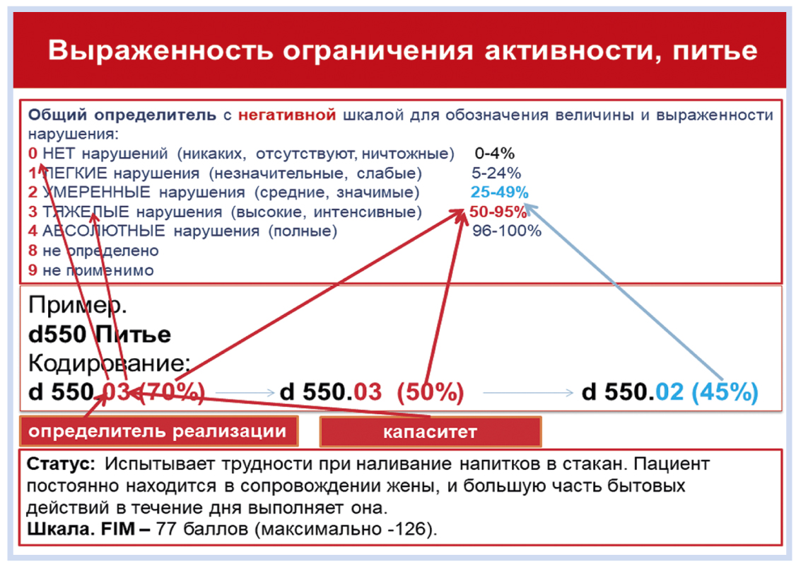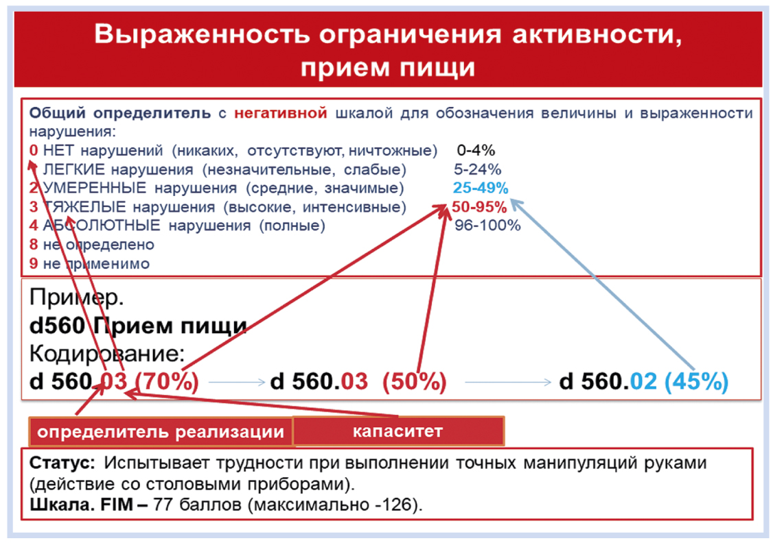 Ограничение активности «прием пищи» кодируется по МКФ как d550, «питье» — как d560. Данные ограничения активности выявлены при неврологическом исследовании и исследовании шкалы FIM. В реализации приема пищи у пациента нарушений не было — d550.03 (70%), цифра 0, капаситет составил тяжелые нарушения — цифра 3, в процентном соотношении — 70%. Восстановлением ограничения активности в приеме пищи занимался эрготерапевт. При выписке в реабилитационном диагнозе установлено, что тяжелое ограничение активности в приеме пищи стало умеренным — d550.02 (45%). | ||||