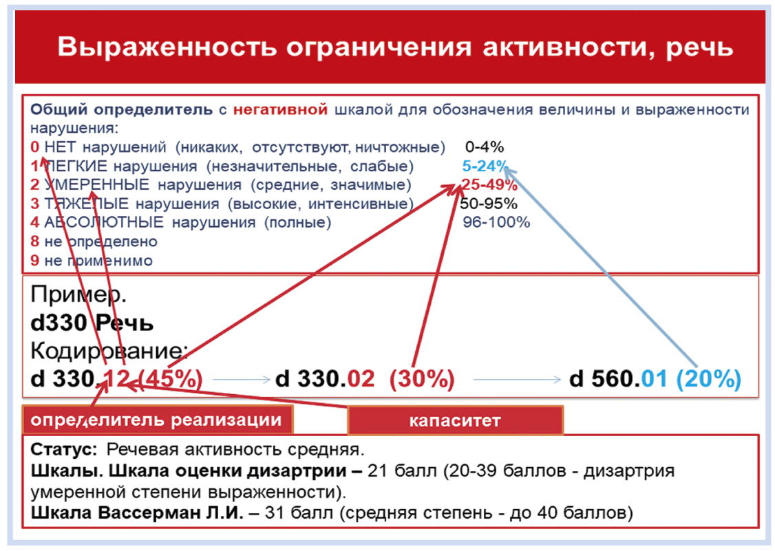 Категорию МКФ «речь» кодируем d330. Неврологический статус, использование оценки дизартрии позволили определить степень нарушений. Код d330.12 (45%) показывает, что определитель реализации составляет 1 — легкие нарушения, капаситет 2 — умеренные нарушения. Медицинские технологии, проведенные медицинским логопедом, характеризуют положительную динамику — d330.01 (20%). | ||||