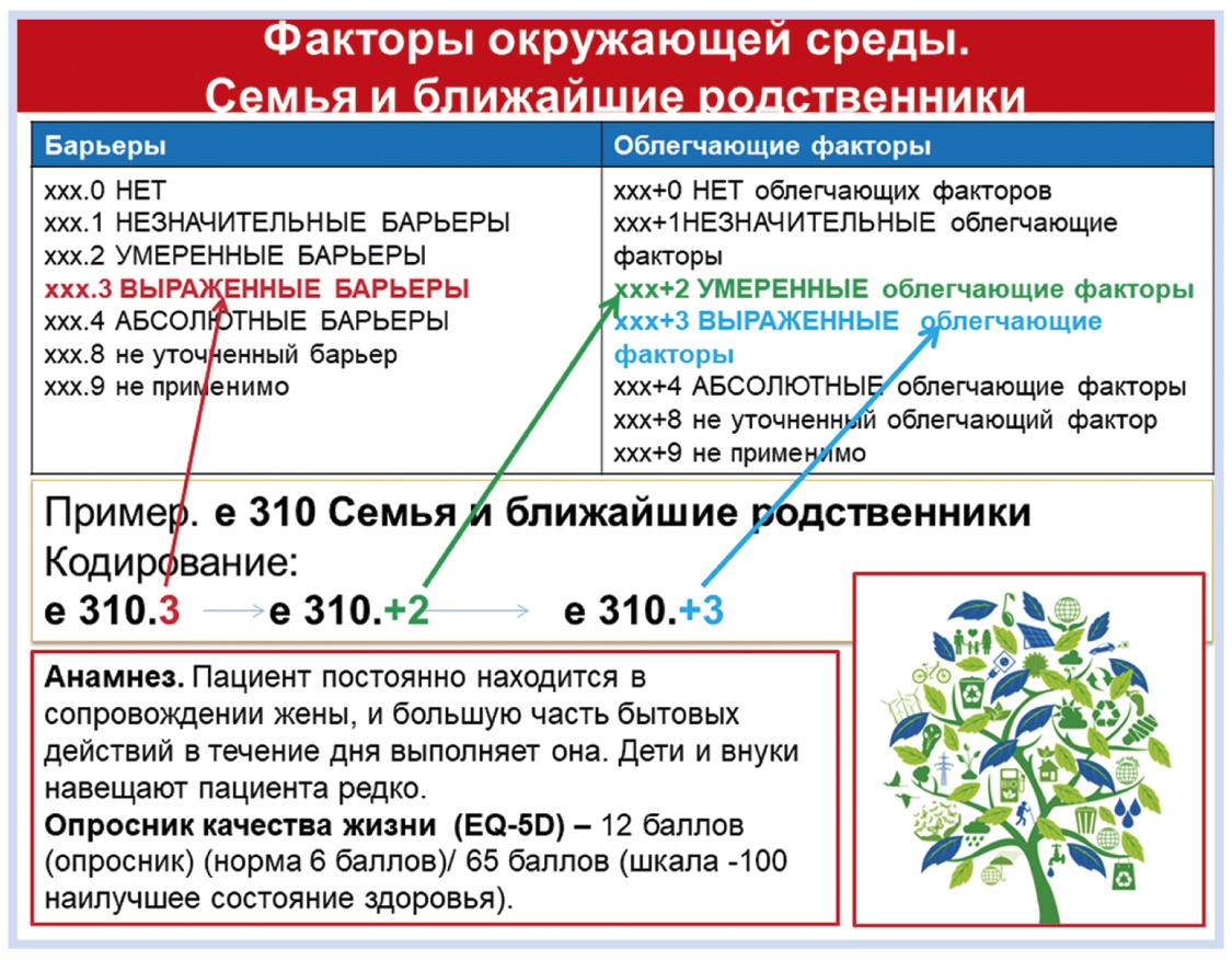 Категория «семья и ближайшие родственники» кодируется е310. В факторах окружающей среды выраженность нарушений обозначается как барьеры со знаком минус (или знак не ставится). Облегчающие факторы — со знаком плюс. Анамнез и опросник качества жизни ЕQ-5D показал у пациента средние цифры. При поступлении у пациента были выраженные барьеры: е310.3, цифра определителя 3. По мере использования реабилитационных технологий психологом, эрготерапевтом, которые обучили жену не вмешиваться в выполнение супругом повседневных действий и оказывать ему только посильную помощь, выраженные барьеры стали выраженными облегчающими факторами — е310.+3. | ||||