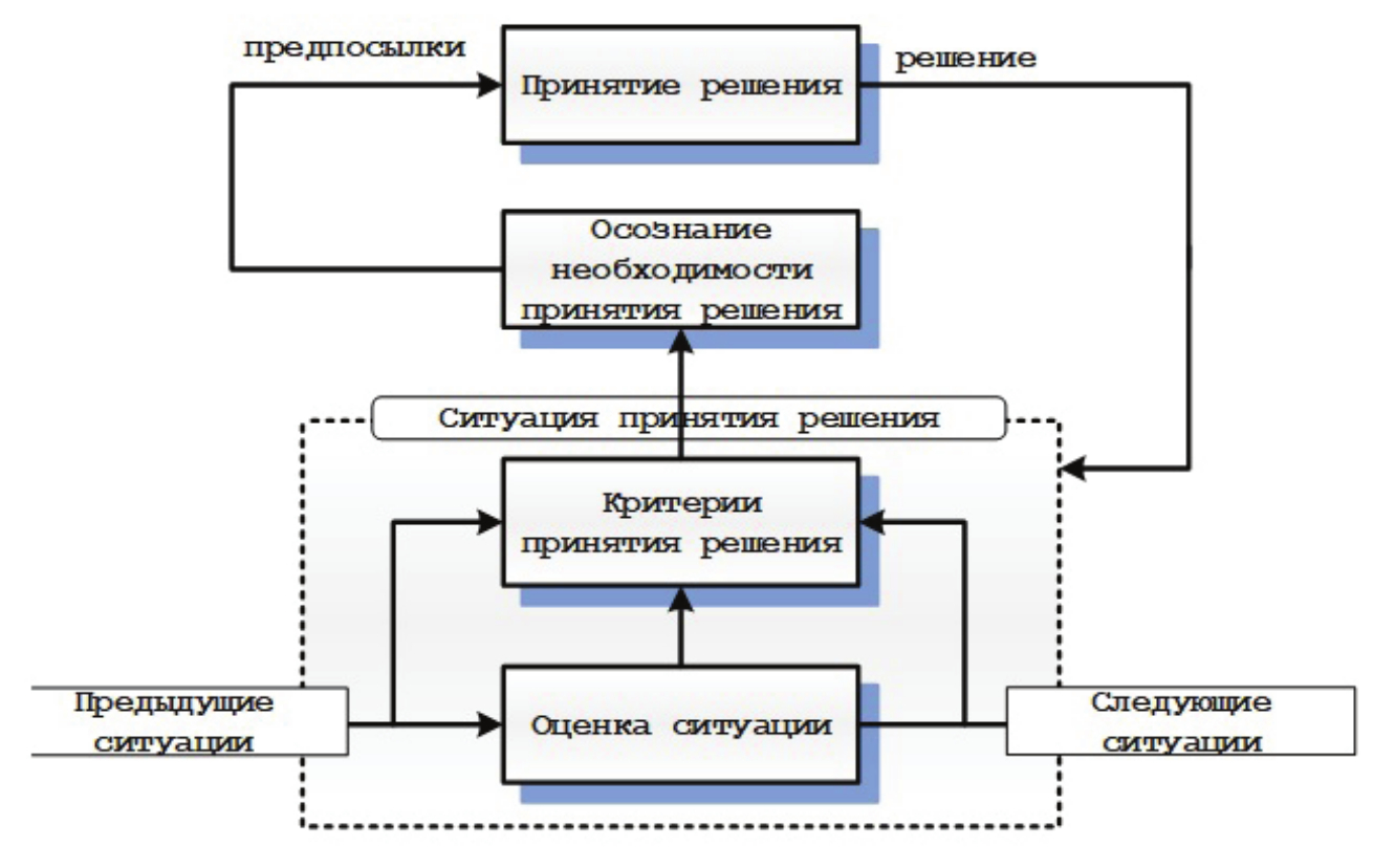 Если принять за основу, что реализация свободы воли состоит в выборе человеком одного из альтернативных действий, в составе деятельности можно выделить модель системы управления, выходом которой является решение о выборе действия, управлением является осознание необходимости принятия решения, а входные данные содержат предпосылки решения. Также выбор решения производится с учетом ограниченности имеющихся ресурсов, прежде всего финансовых и материальных. Схематично этот процесс изображен на рис. 1.