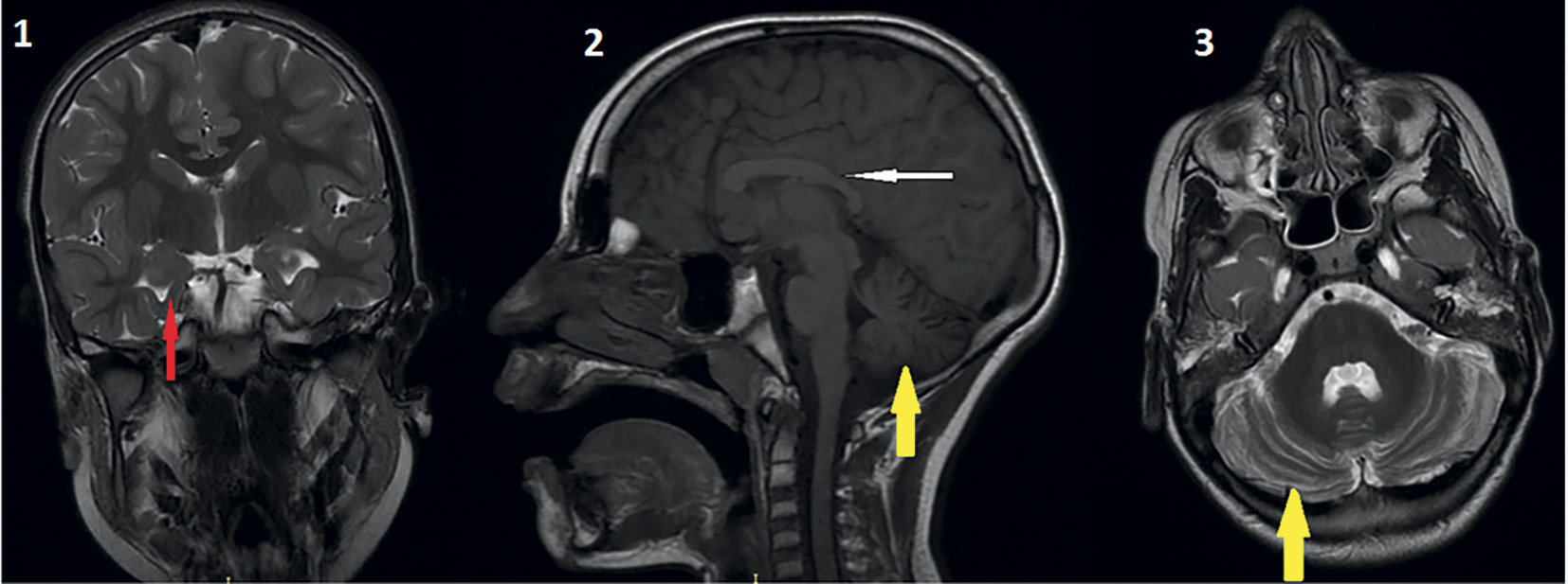 Рис. 2. МРТ головного мозга у пациента 8 лет с СПХ. 1 — уменьшение размеров и изменение конфигурации гиппокампов (красная стрелка), фронтальное T2-взвешенное изображение; 2 — дисплазия мозолистого тела (белая стрелка), атрофия мозжечка (желтая стрелка), сагиттальное T1-взвешенное изображение; 3 — атрофия мозжечка (желтая стрелка), аксиальное Т2-взвешенное изображение.