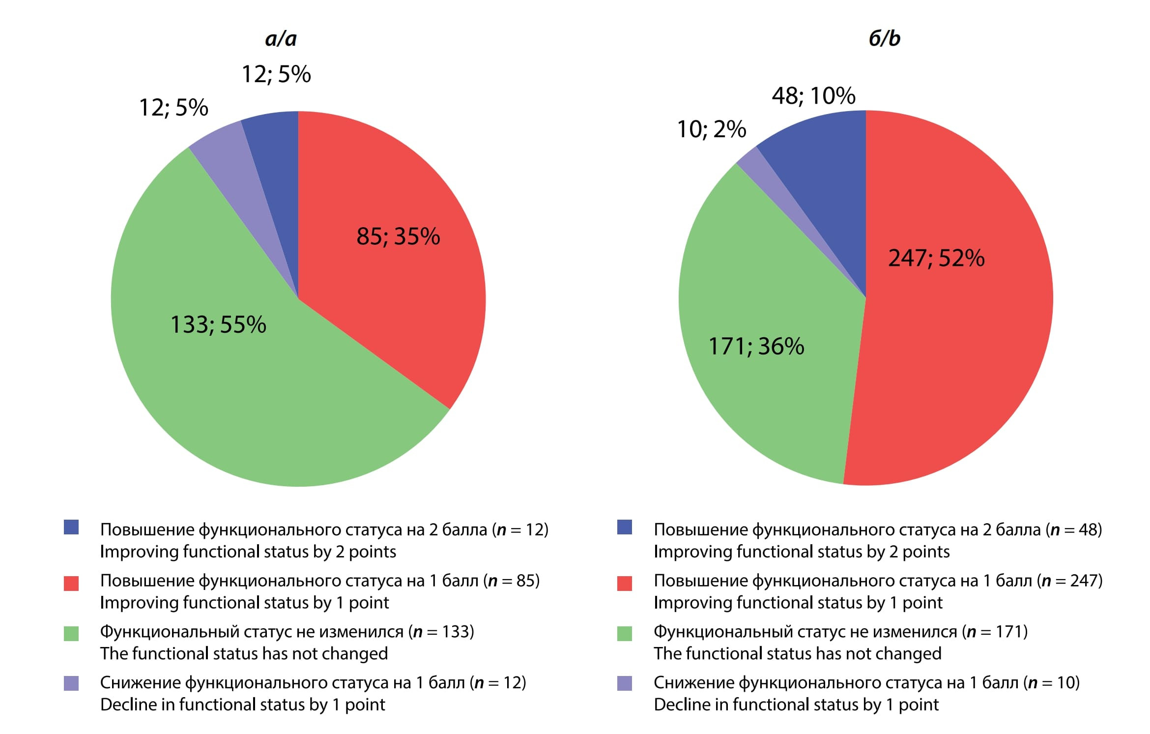 Сравнительная оценка функциональных результатов оперативного лечения по шкале Gillette FAQ (рис. 1) показала повышение балльной оценки, отражающей физическую активность пациентов, во 2-й группе — у 295 (61,97%) пациентов, в 1-й группе — у 97 (40,08%) пациентов. Отсутствие динамики функционального статуса по данному показателю во 2-й группе отмечено только у 171 (35,92%) пациента, а в 1-й группе — у 133 (54,96%) пациентов. Функциональный статус снижался у 10 (2,10%) пациентов 2-й группы и у 12 (4,96%) — 1-й. На основании динамики функционального статуса у пациентов 2-й группы отмечено статистически значимое повышение эффективности оперативного лечения пациентов по сравнению с пациентами 1-й группы (p < 0,05). На основании анализа функциональных результатов был сделан вывод о более высокой эффективности оперативного лечения во 2-й группе, где оно планировалось на основании прогноза двигательного развития ребенка с ДЦП.