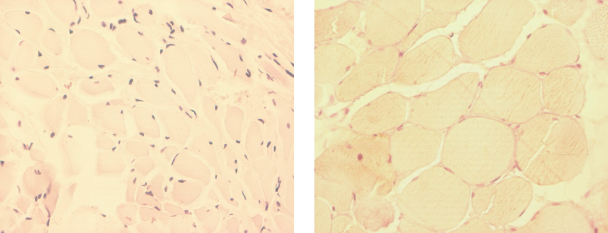 а — отсутствие мерозина в мышцах при окрашивании; б — нормальная мышечная биопсия.