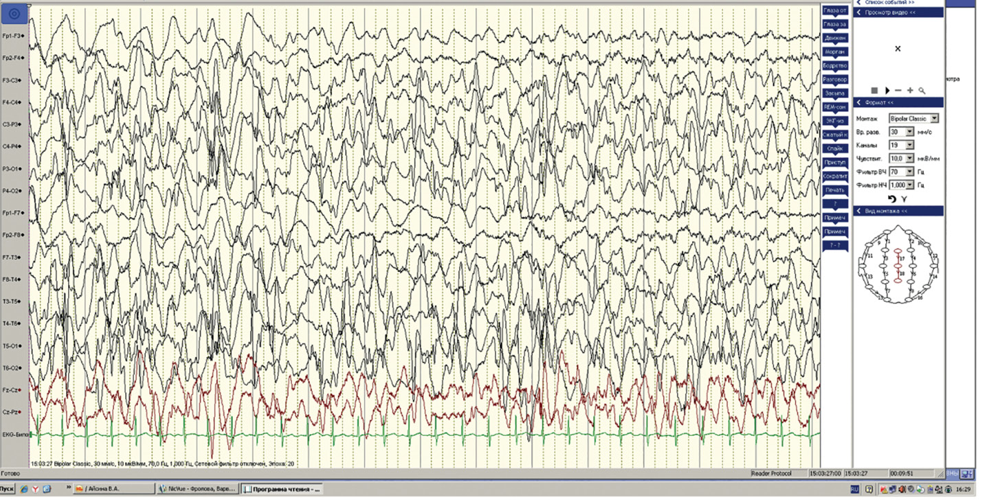 Рис. 3. Монтаж Double Banana. Ассиметричный вариант модифицированной гипсаритмии. Выраженное преобладание эпилептиформной активности (ЭА) в правой гемисфере у ребенка 1 года.