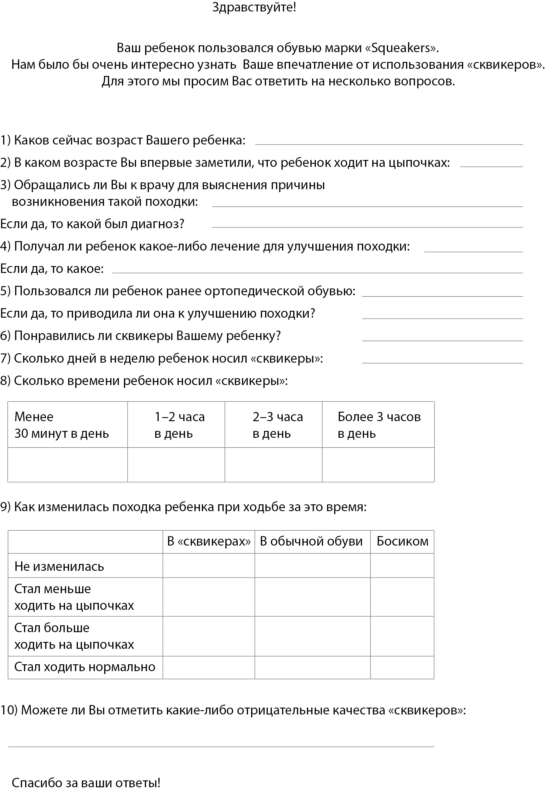 Вопросы, на которые отвечали родители, касались времени появления ИХЦ («В каком возрасте Вы впервые заметили, что ребенок ходит на цыпочках?»), результатов посещения врача в связи с этим («Обращались ли Вы к врачу для выяснения причины возникновения такой походки; если да, то какой был диагноз?»). Также родителей просили охарактеризовать предшествовавшие попытки лечения («Получал ли ребенок какое-либо лечение для улучшения походки; если «Да», то какое?», «Пользовался ли ребенок ранее ортопедической обувью; если «Да», то приводила ли она к улучшению походки?»). Также оценивалось общее впечатление от обуви («Понравились ли «сквикеры» Вашему ребенку?», «Можете ли Вы отметить какие-либо отрицательные качества «сквикеров»?»). Родителей просили уточнить, сколько дней в неделю и сколько времени в день ребенок носил «сквикеры», а также как изменилась походка ребенка при ходьбе за это время при ходьбе в «сквикерах», в обычной обуви и босиком.