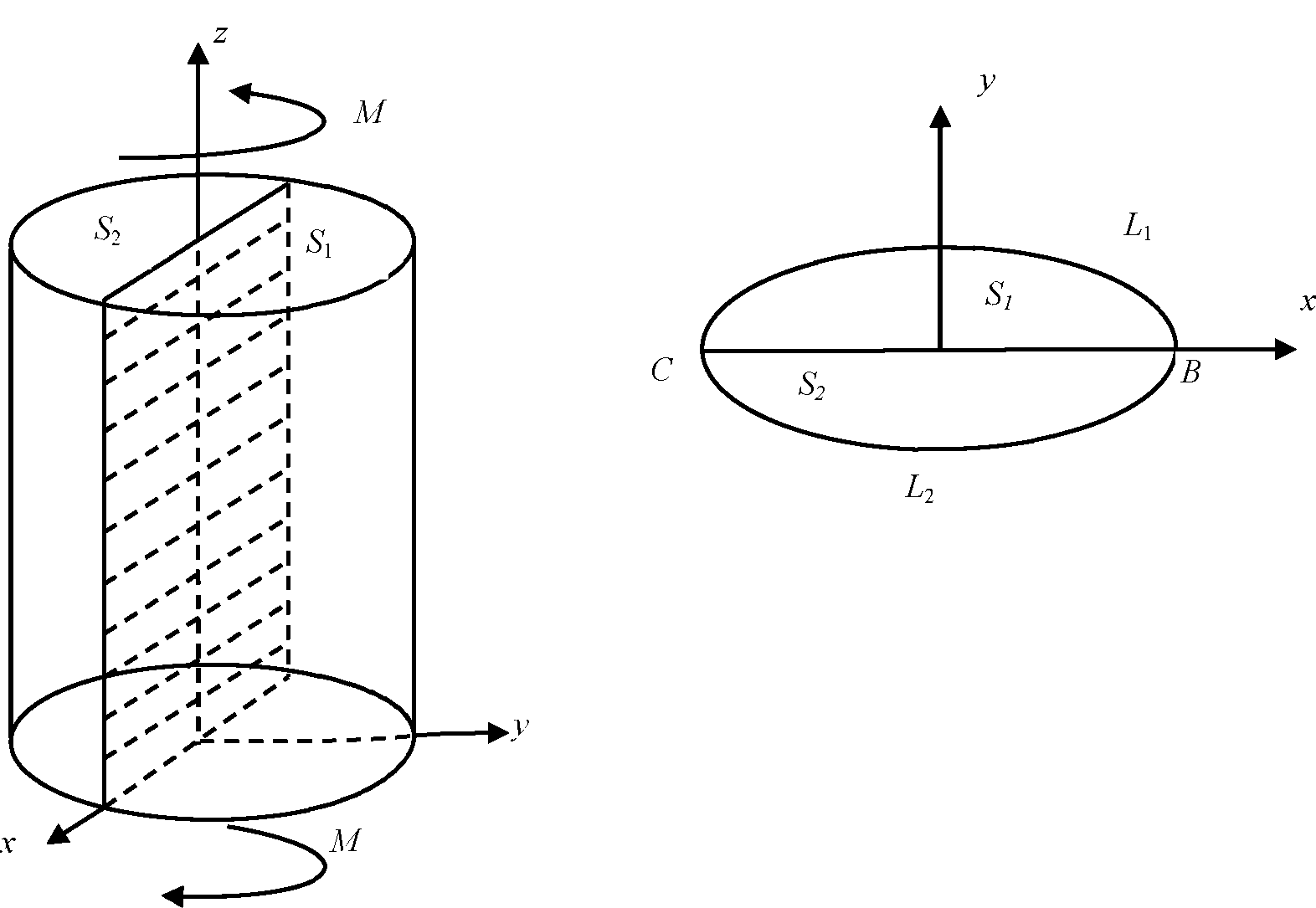 Рассмотрим прямолинейный стержень, поперечное сечение которого изображено на рис. 1. Пусть S1 и S2 области, занятые упруго-пластическими изотропными материалами, у которых предел текучести при чистом сдвиге одинаковый и равен k, а упругие постоянные Ламе различны и равны λ1, μ1 и λ 2, μ2 соответственно. Пусть линия раздела материалов прямолинейна. Выберем ось координат ОХ вдоль линии раздела. Предполагается, как обычно, что боковая поверхность стержня свободна от напряжений, а стержень скручивается парой сил с моментом