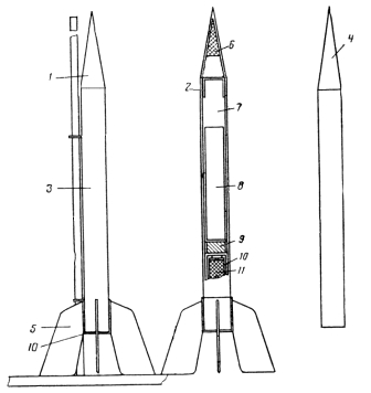 Оснащение модели ракеты: ракетный двигатель 10, парашют системы спасения 8, пыж 9 и два направляющих кольца.