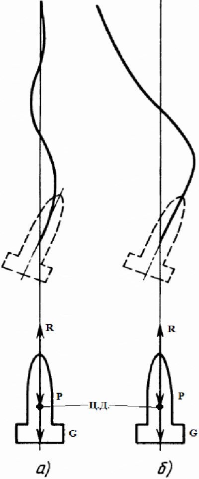 На рис. 2 рассмотрим два случая поведения модели ракеты во время ее движения по вертикальной траектории. Угол атаки равен нулю - ось модели совпадает с направлением полета. В идеальных условиях (при отсутствии внешних помех) такая траектория сохраняется в течение всего полета. В действительности такого почти не бывает. Внешние силы (ветер, непостоянная тяга двигателя) вносят погрешности в траекторию полета за счет появления угла атаки не равного нулю. Если модель статически устойчива (рис. 2, а), то она сама возвратится к нулевому углу атаки. Неустойчивая же ракета (рис. 2, б) еще больше увеличит угол атаки и сильнее отклонится от первоначальной вертикальной траектории.