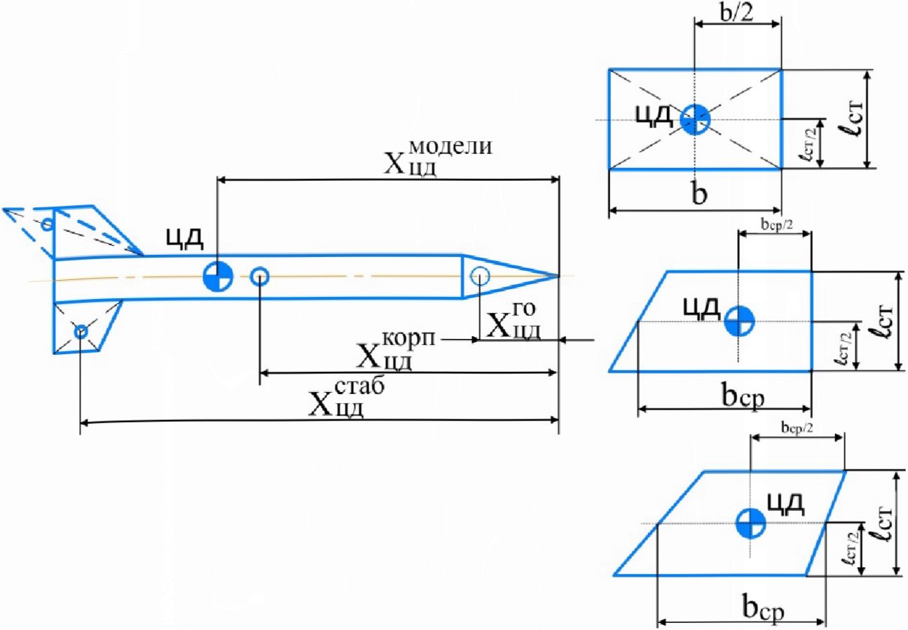 где — площадь проекции головного обтекателя; - площадь проекции корпуса модели; - площадь проекции всех стабилизаторов; Sмод - сумма всех площадей; - ордината ц. д. головного обтекателя; - ордината ц. д. корпуса модели: - ордината ц. д. стабилизаторов.