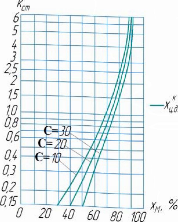 Положение центра давления зависит от относительного удлинения корпуса модели . Для модели ракет с цилиндрическим корпусом без оперения и коническим (или более близким конусу) головным обтекателем положение ц. д. на оси модели можно найти по графику (рис. 5). Зная положение ц. т. и ц. д. неоперённого корпуса, задаемся запасом устойчивости С (С = 30, С = 20, С = 10) и по графику находим предлагаемый авторами коэффициент влияния стабилизаторов КСТ, зная который можно вычислить площадь одного оперения стабилизатора у 4-стабилизаторной модели (рис. 6):