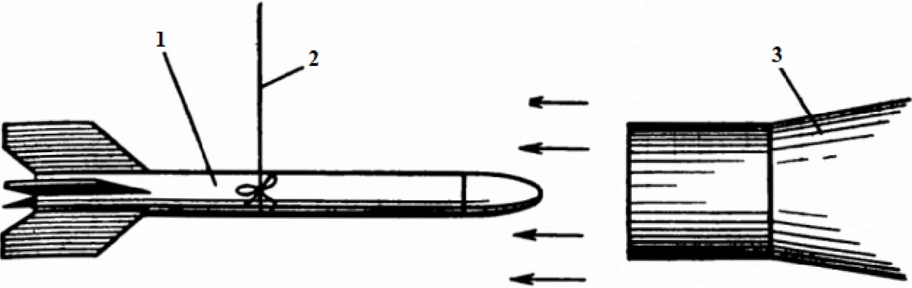 Рис. 8. Испытания модельной ракеты в потоке воздуха, выходящего из сопла аэродинамической трубы: 1 – модельная ракета; 2 – нить; 3 – аэродинамическая труба