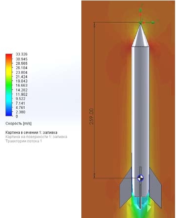 Рис. 9. Продувка модели ракеты с трапециевидными стабилизаторами в программе SolidWorks Flow Simulation