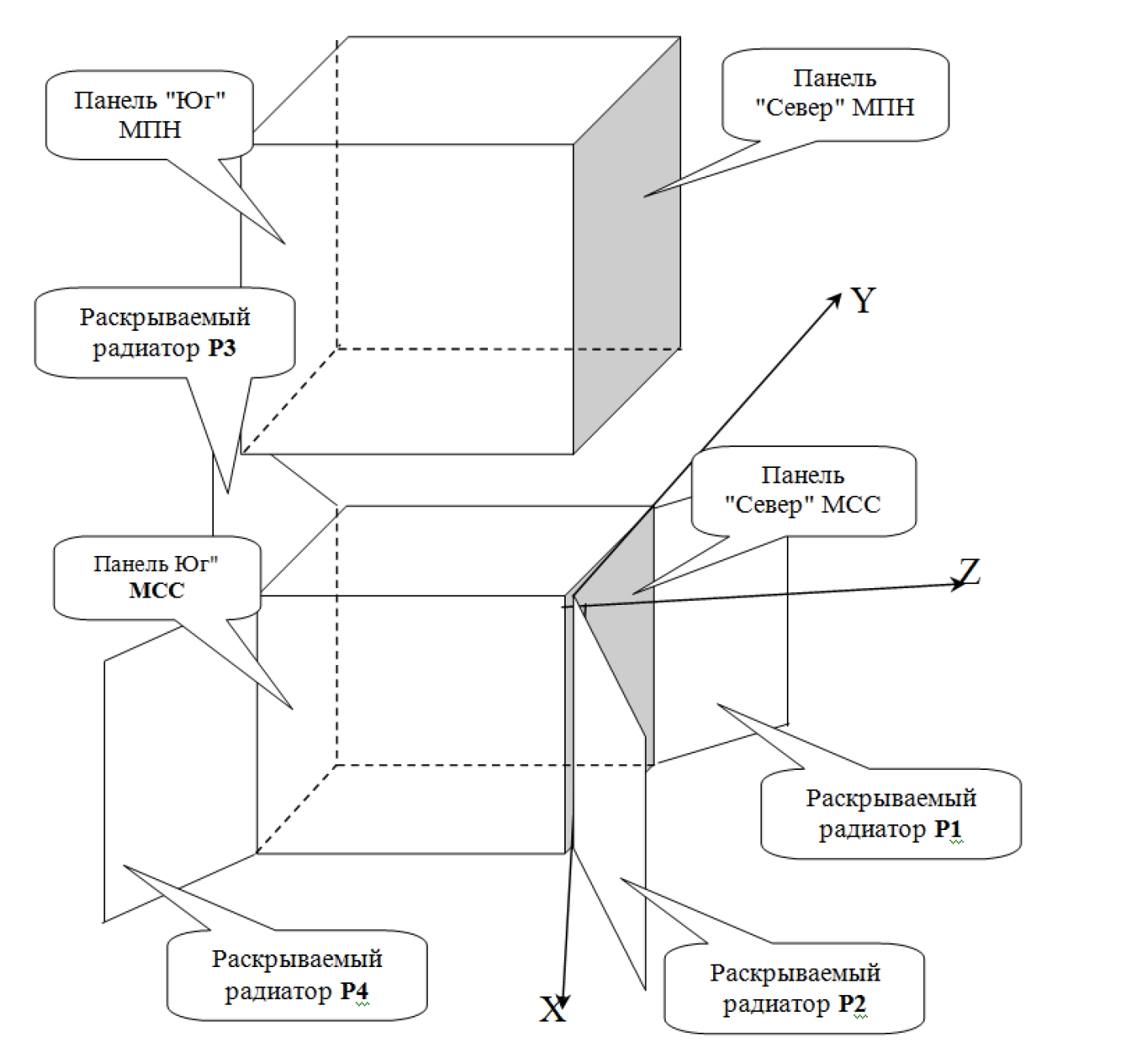 Дополнительные радиационные поверхности могут быть выполнены в виде откидных панелей-радиаторов, при этом угол наклона раскрываемых радиаторов предпочтительно должен составлять ~20° к панелям ±Z.