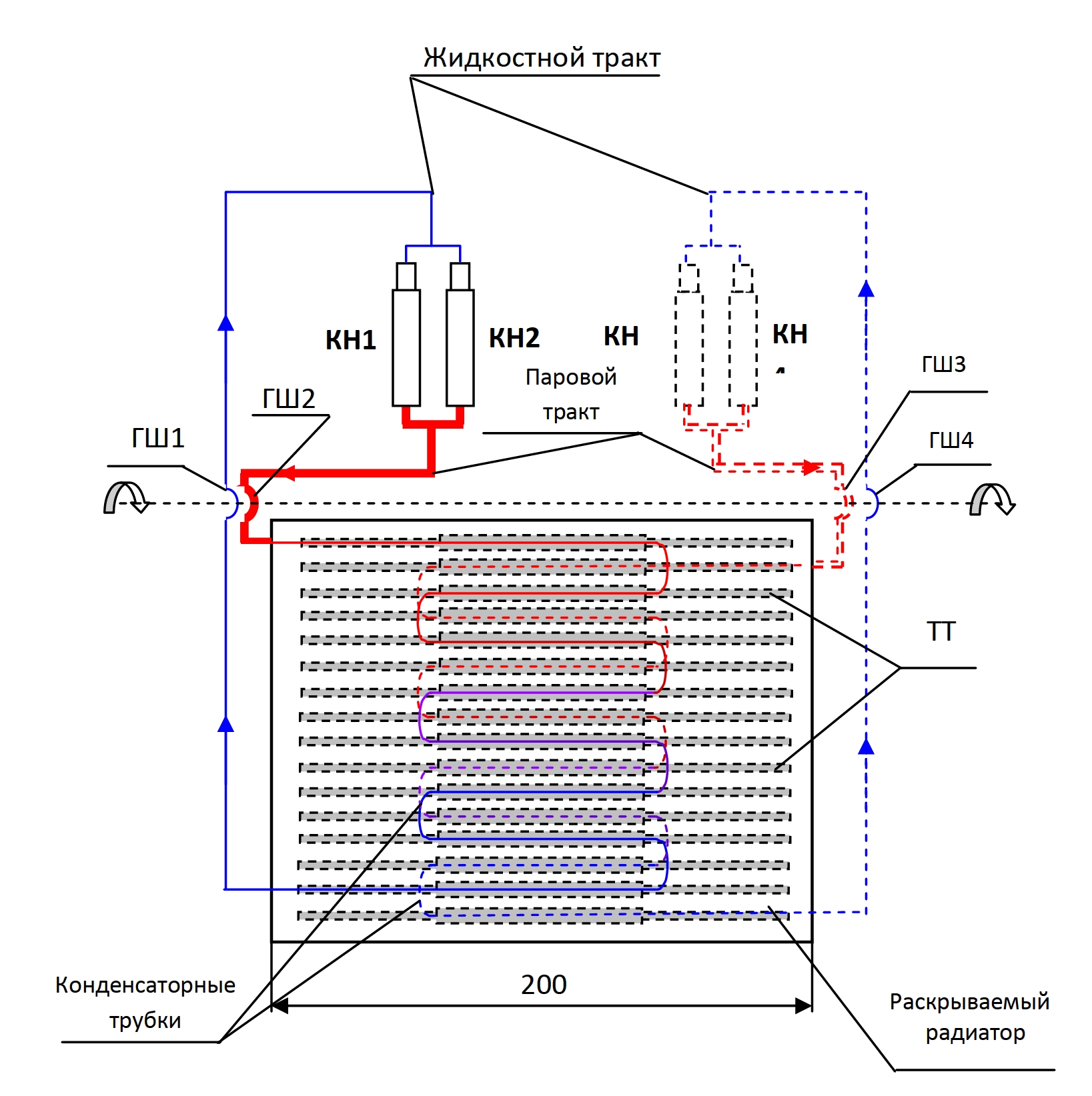 Рис. 3. Схема раскрываемого радиатора на КТТ (вариант 1): КН – капиллярный насос; ГШ – гибкий шланг; ТТ – тепловая труба_____ контур 1; -------- контур 2