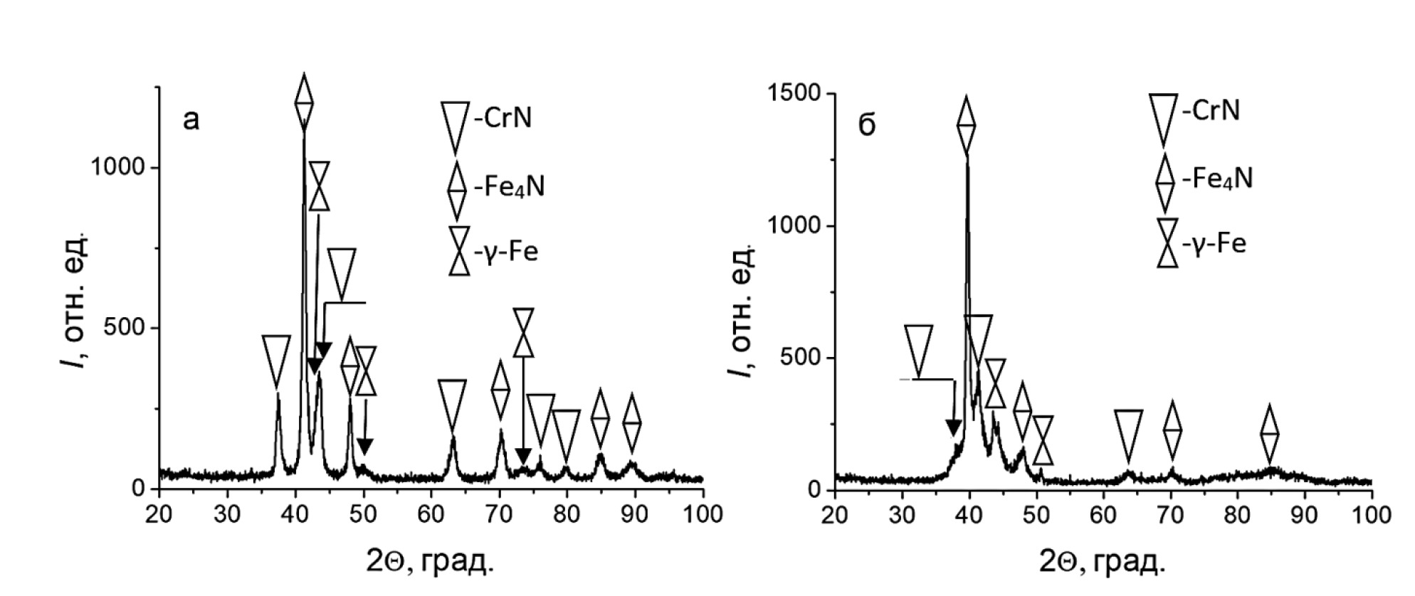 Рис. 1. Фрагменты рентгенограмм стали 20X231118, подвергнутой азотированию в плазме газового разряда низкого давления: а - элионное азотирование; б - ионное азотирование. Температура азотирования 793 К, время азотирования 3 ч