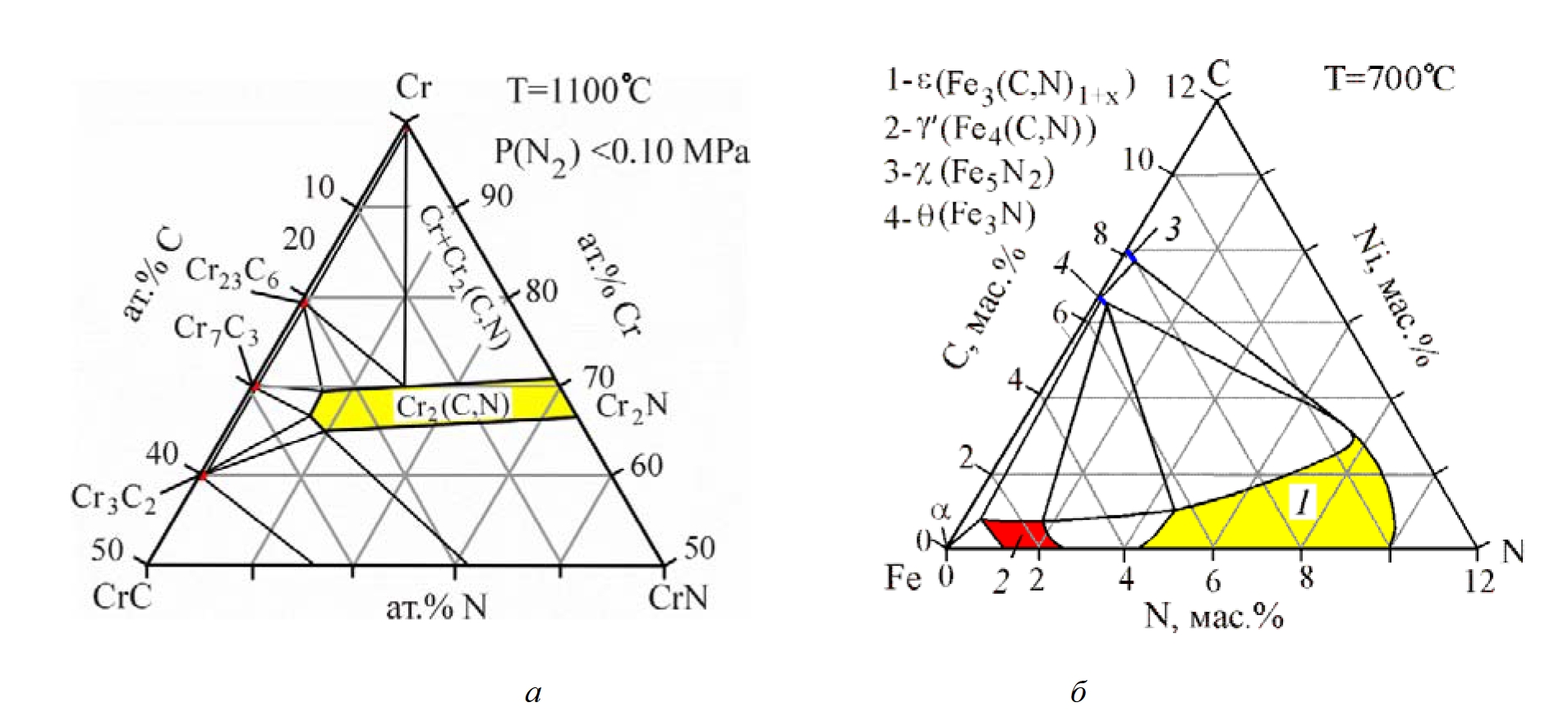Fig. 2. Isothermal cross sections of C-Cr-N ternary systems in the metastable state at a temperature of 1100°C and pressure P(N2)<0.10 MPa [14] (a), C-Fe-N at a temperature of 700°C [ 15] (Z>)