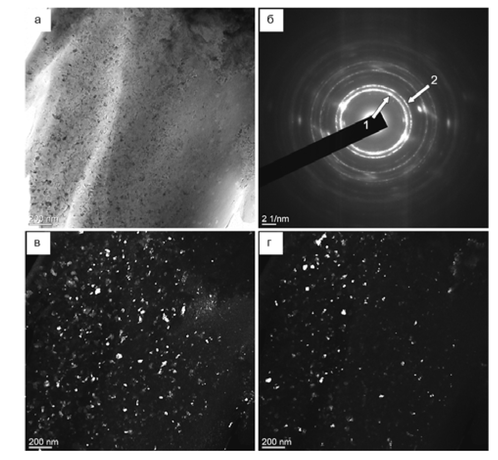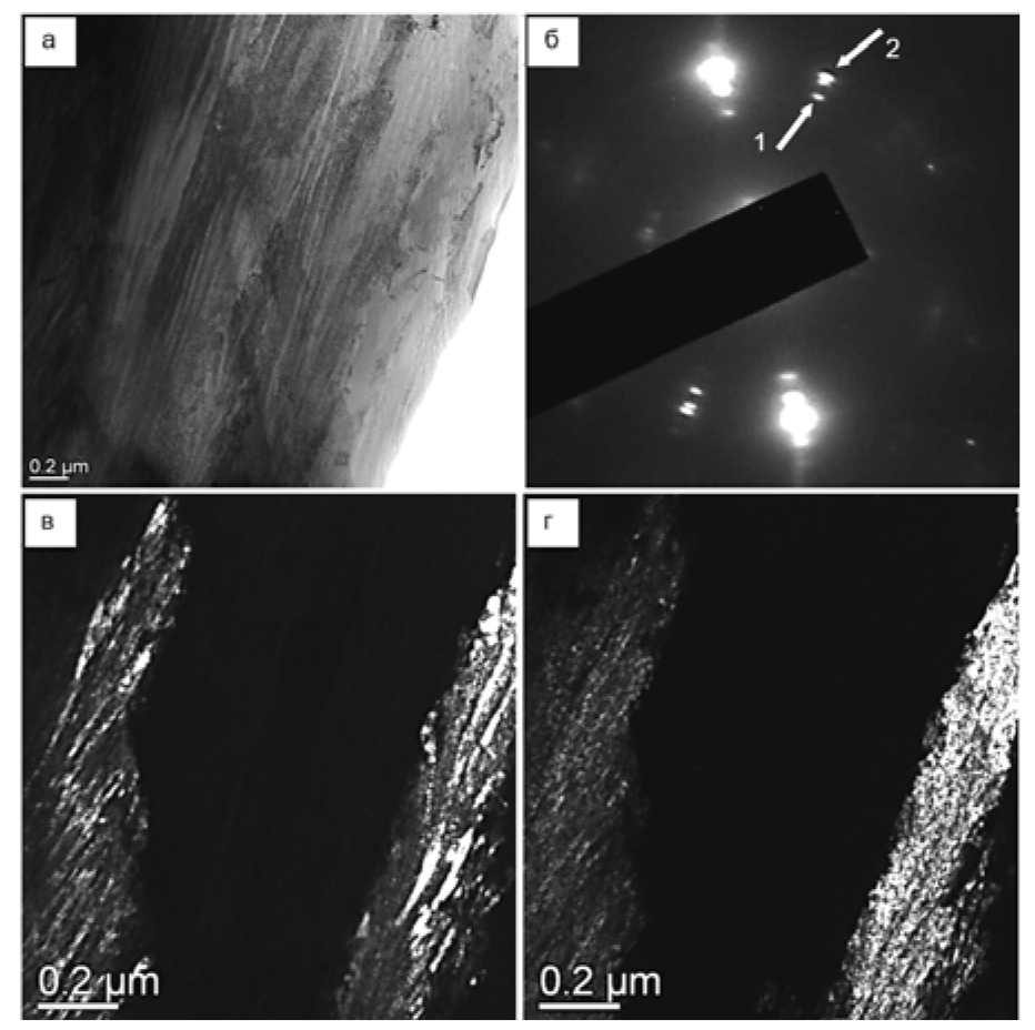 Fig. 4. Electron microscopic image of the structure of the surface layer of steel 20X23H18 subjected to nitriding under conditions of heating of samples of the ionic component of the plasma: a - bright field; b - microelectron diffraction pattern obtained from this section of the foil; (c, d) dark fields obtained in (c) [ 1111 CrN and (cl) [111] y-Fe + [111] Fe4N reflections. In (b), the arrow indicates the reflections in which dark fields were obtained reflection No. 1 (c) and reflection No. 2 (d)