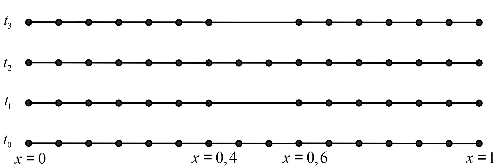 Численное решение задачи (1)–(4) будем искать во всех узлах сетки (рис. 1).